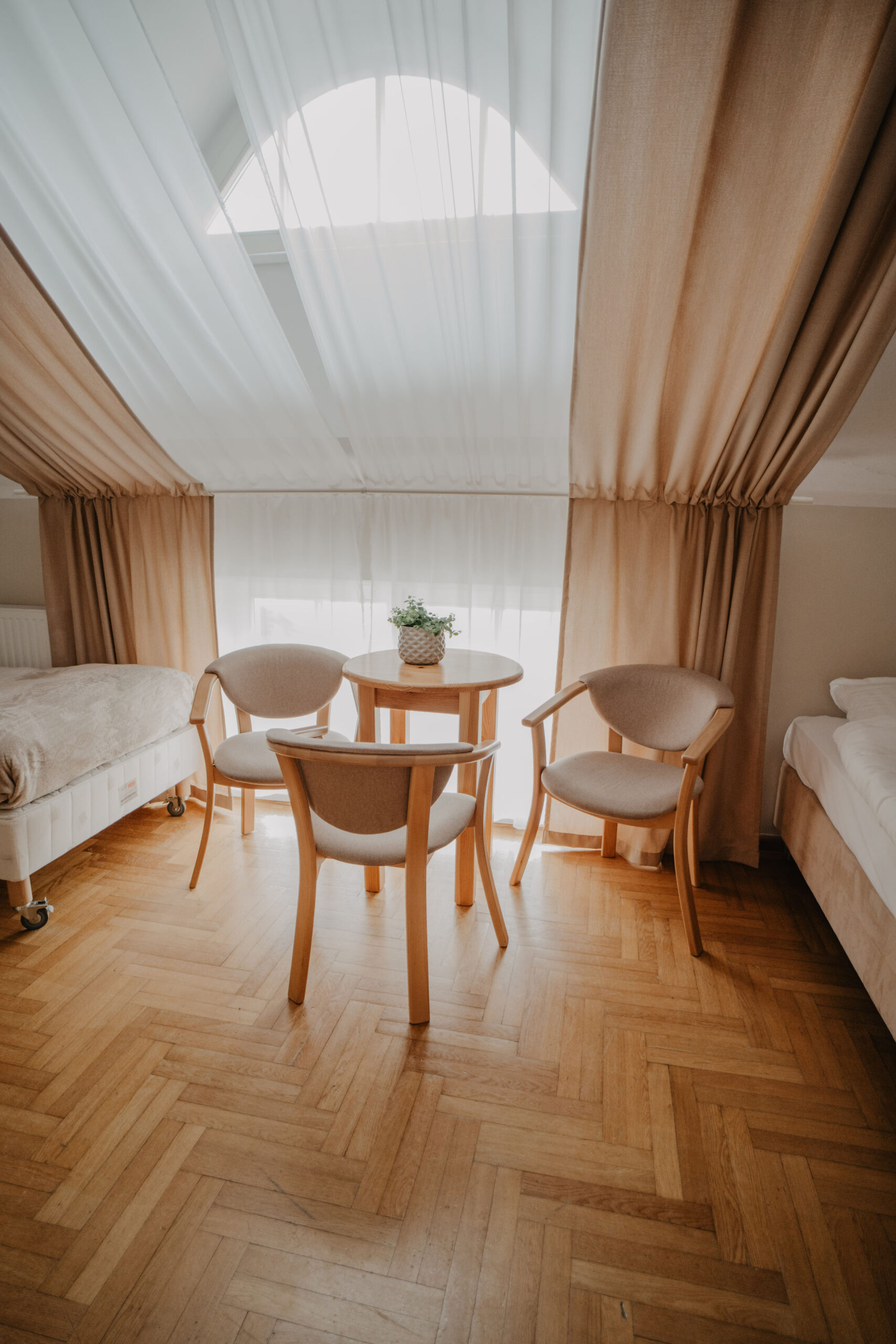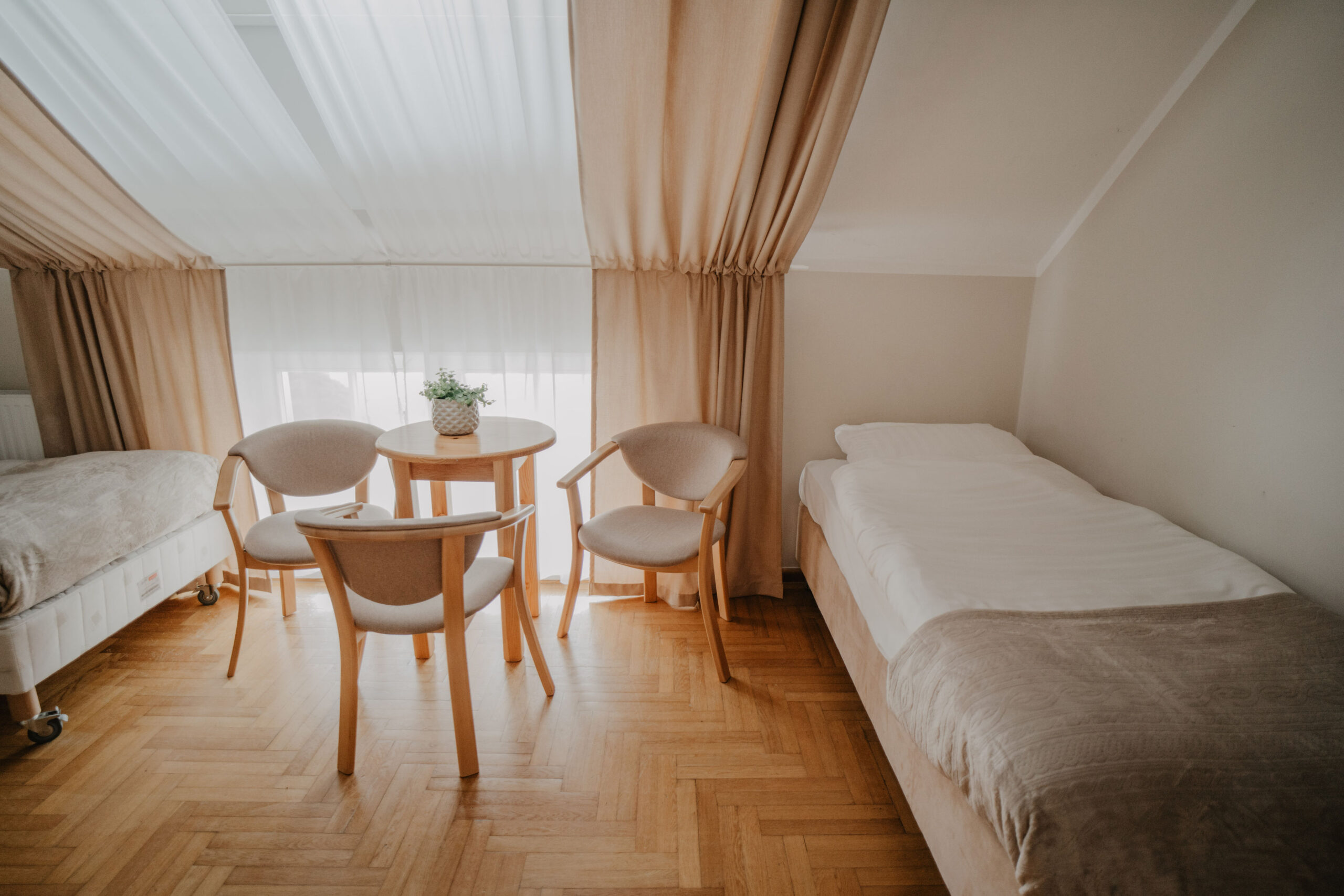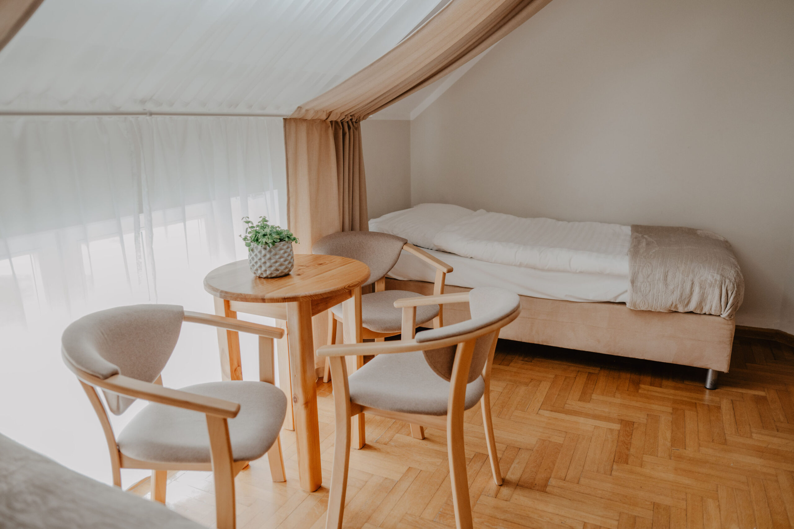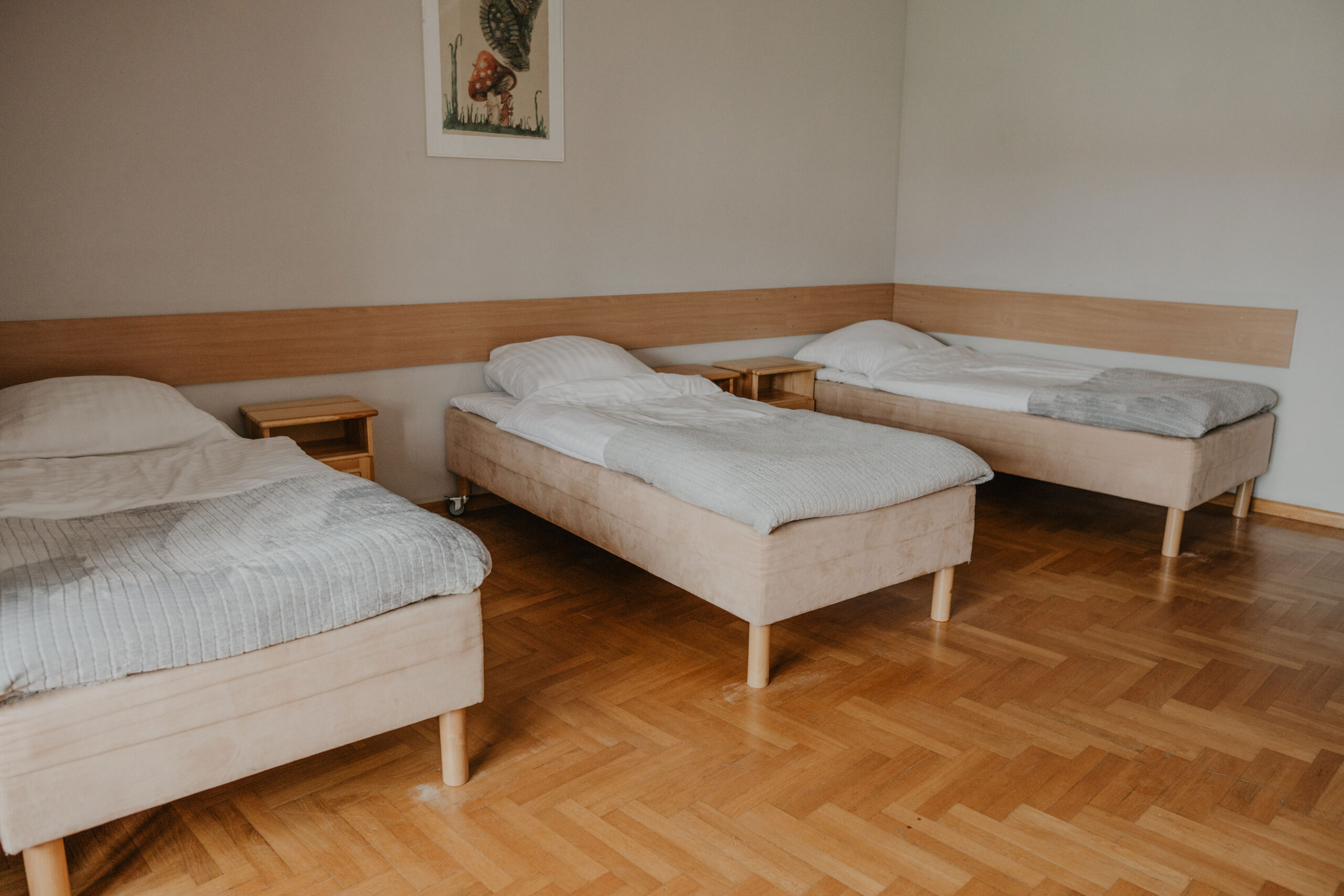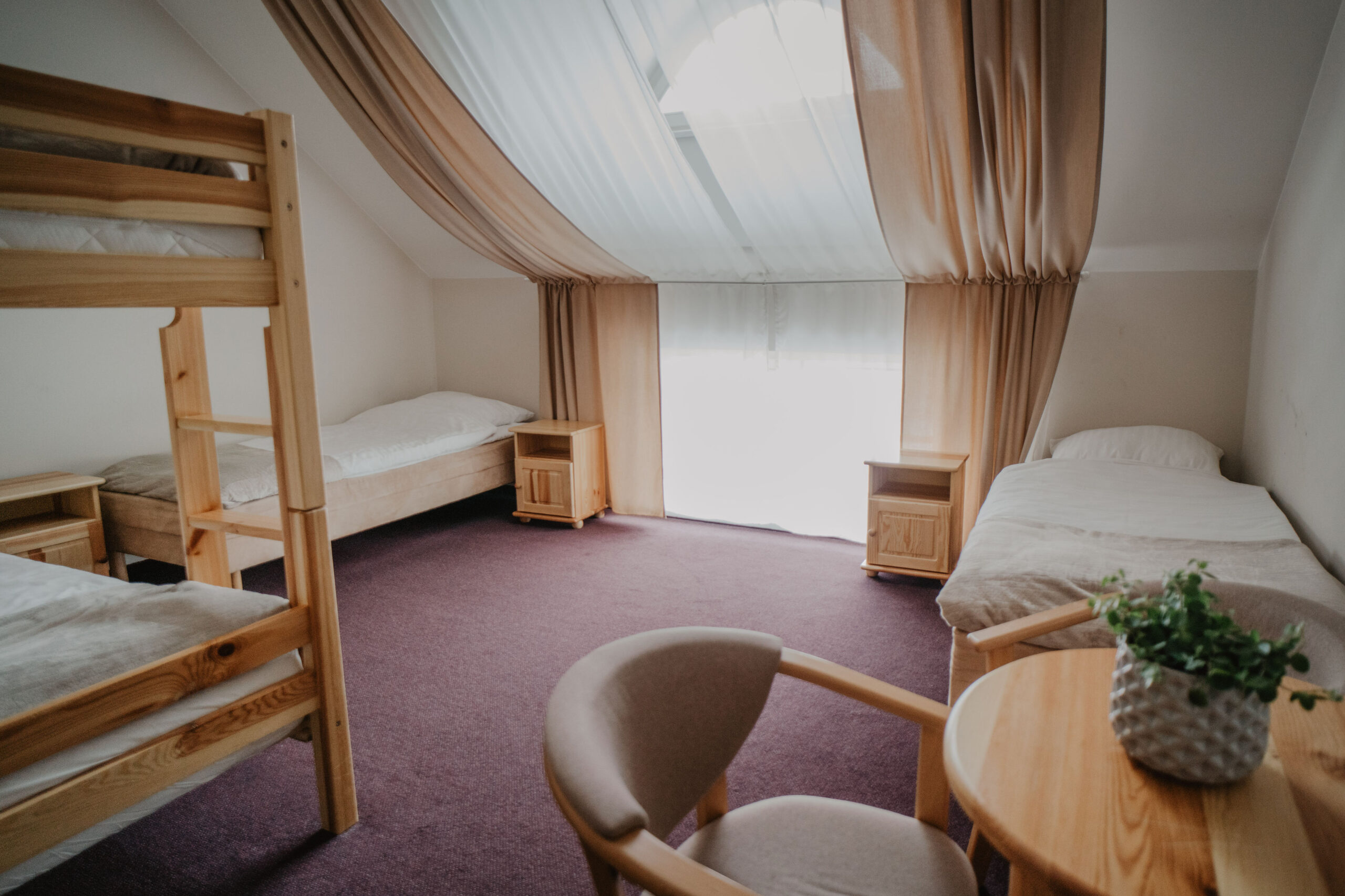 The comfortable quadruple room with a private bathroom is located on the first floor of Obora. The room has two single beds, one bunk bed, a wardrobe with clothes hangers and a table with three chairs. In the private bathroom with a shower cabin you will find a set of towels, soap and toilet paper. Free internet is available in all our buildings.