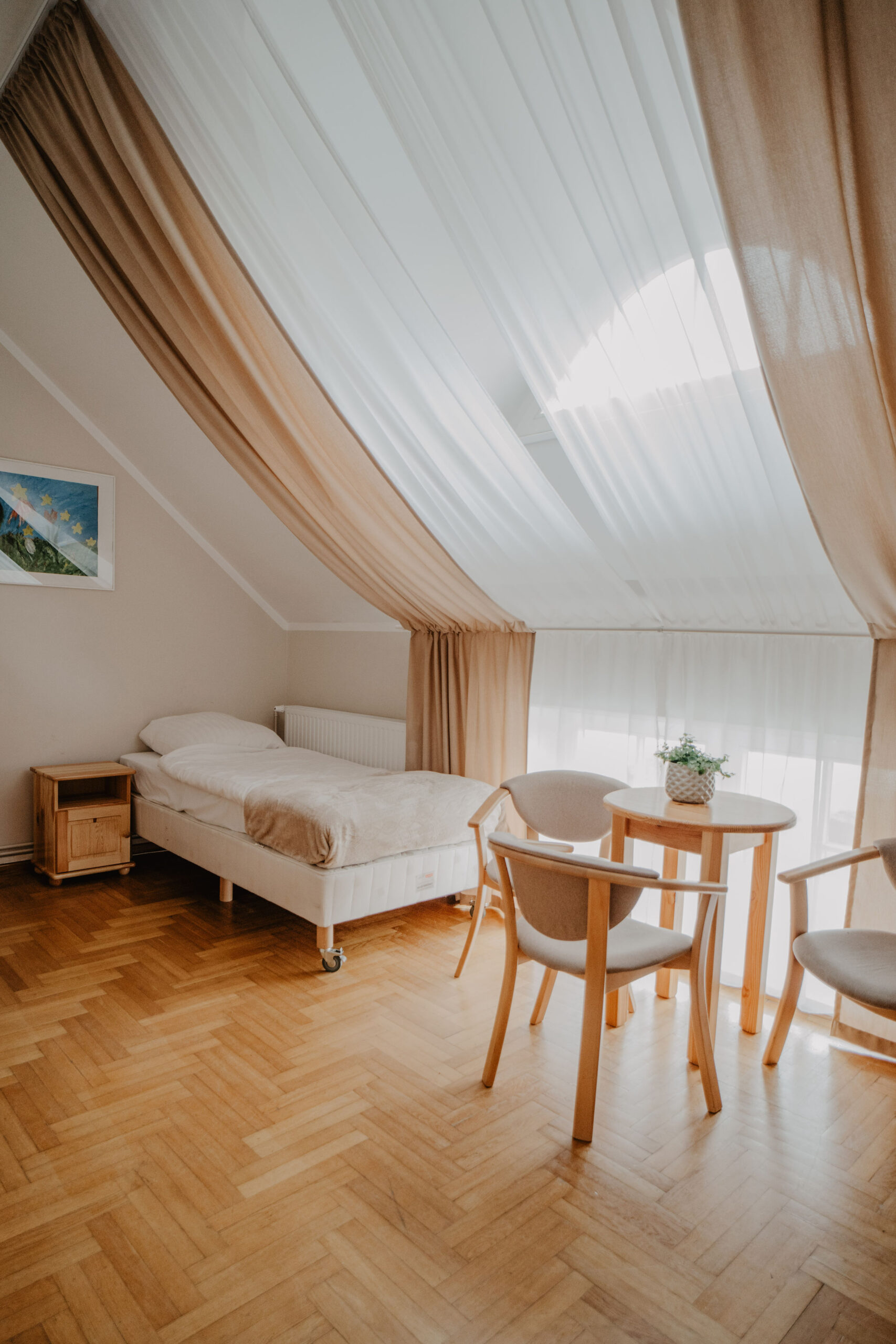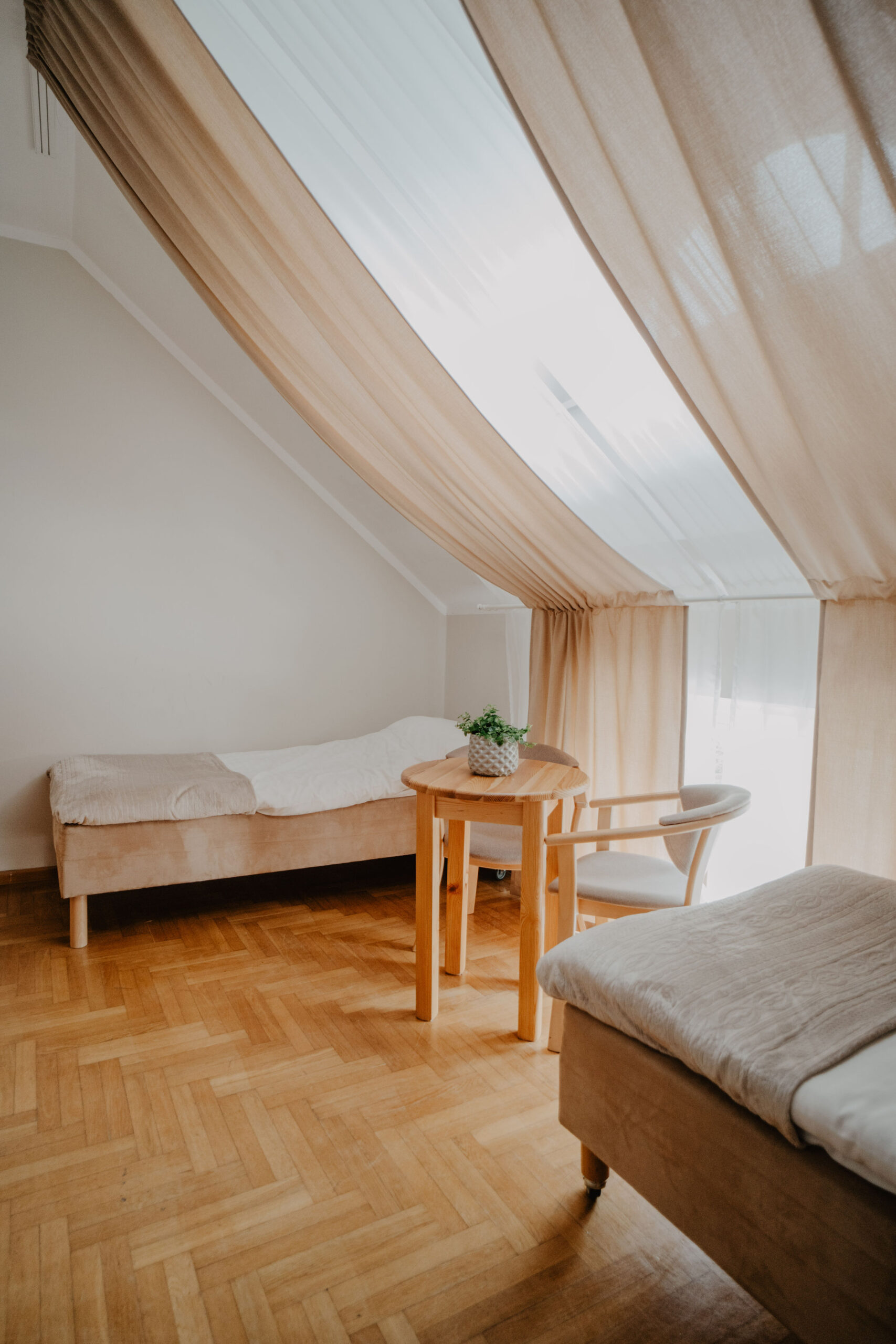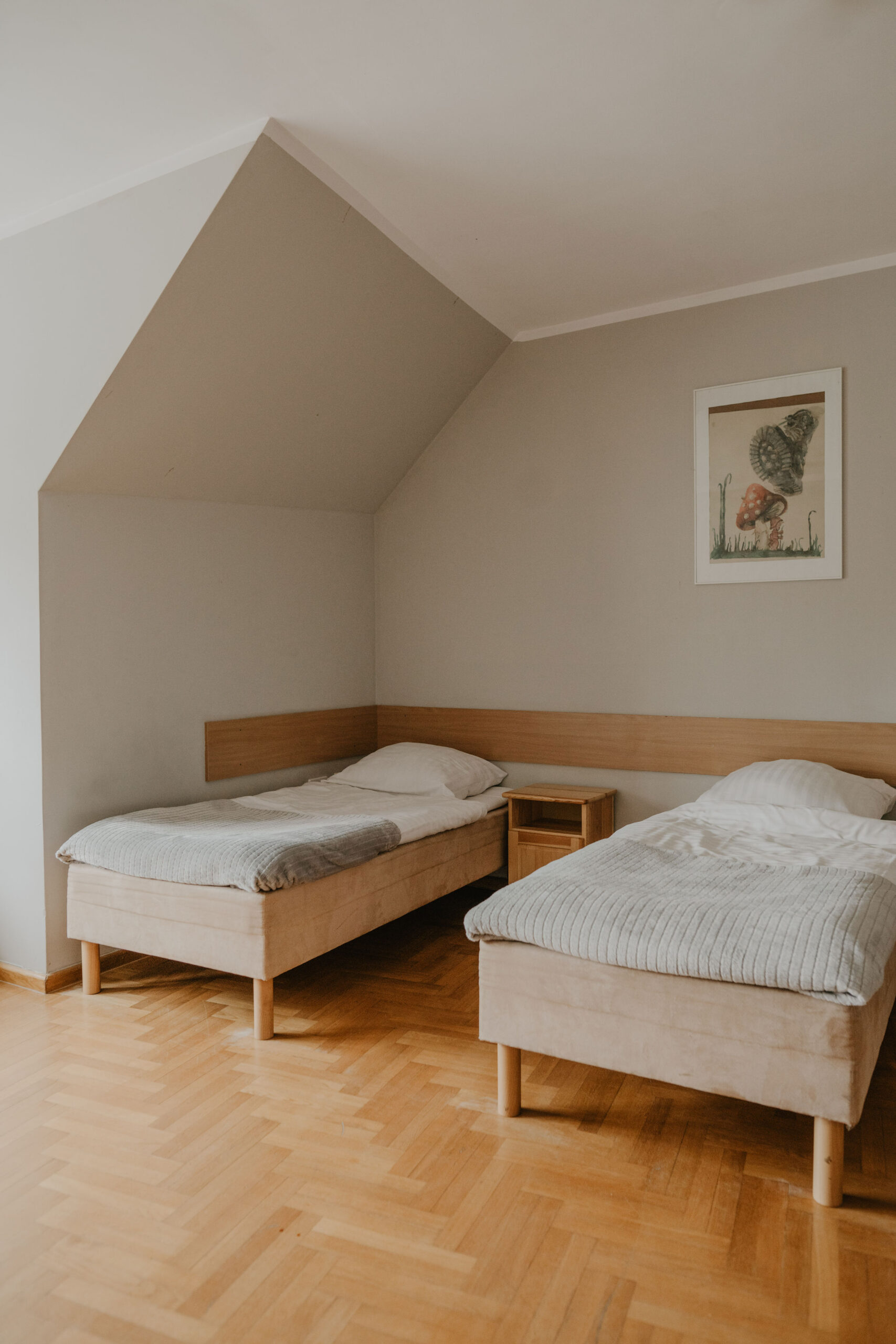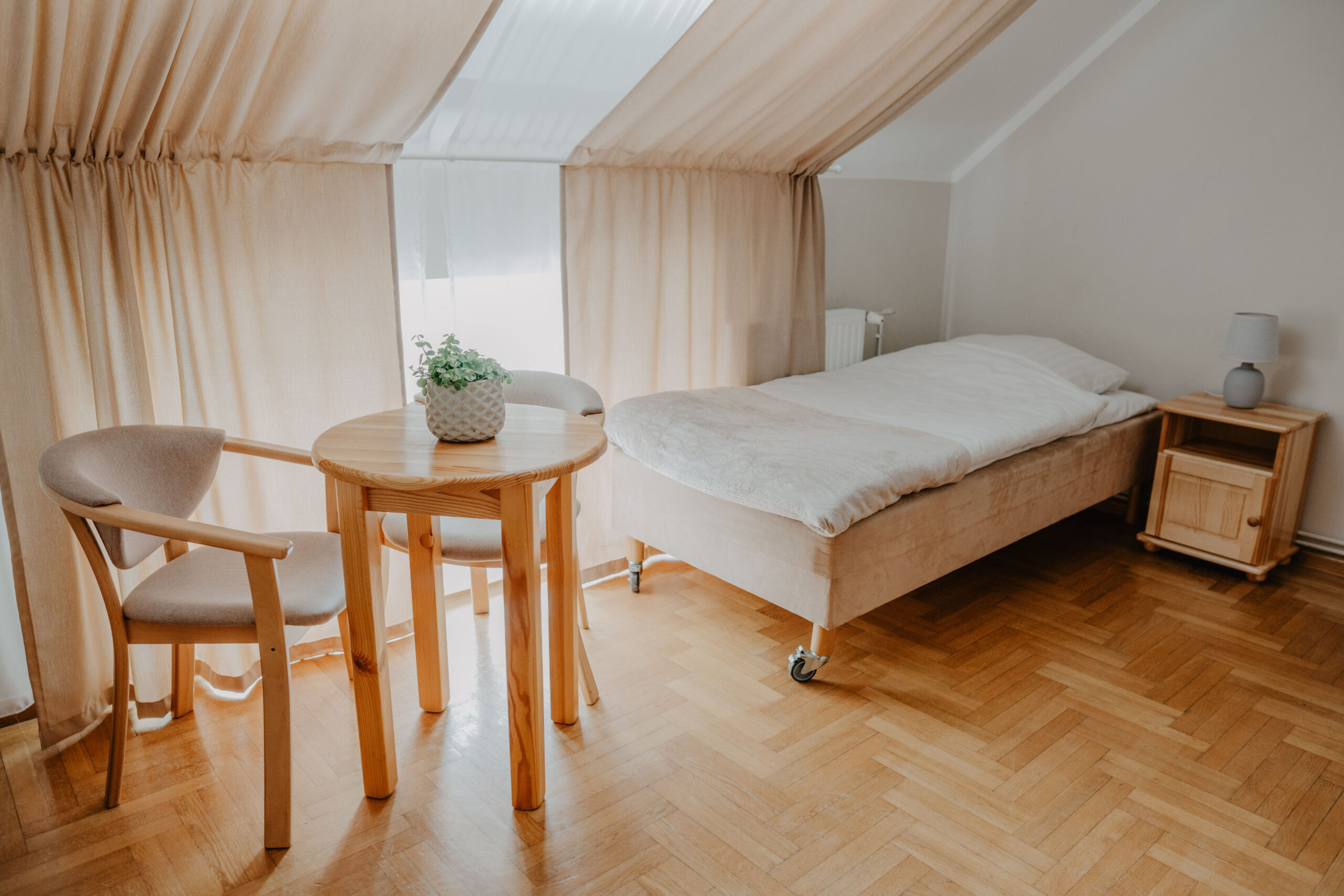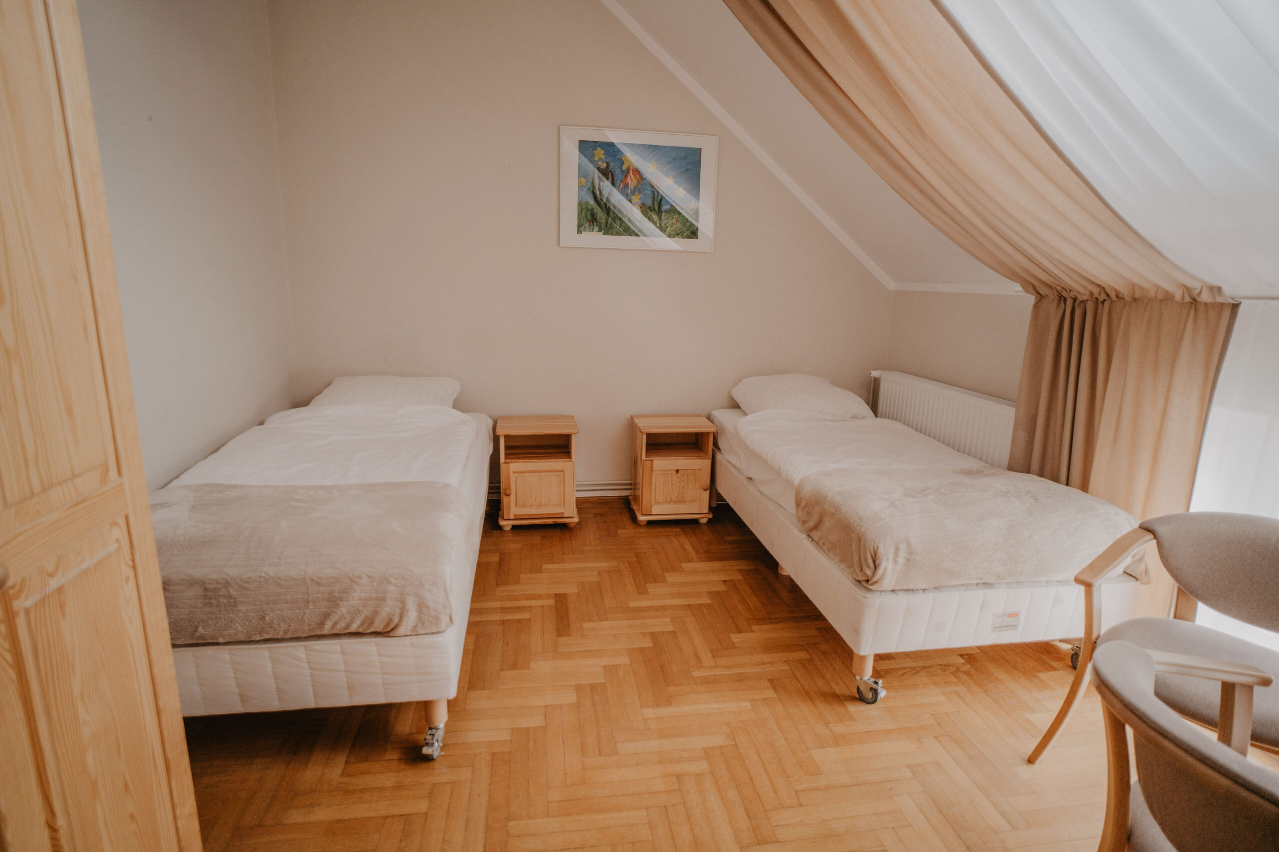The comfortable quadruple room with a private bathroom is located on the first floor of Obora. The room has two single beds, one bunk bed, a wardrobe with clothes hangers and a table with three chairs. In the private bathroom with a shower cabin you will find a set of towels, soap and toilet paper. Free internet is available in all our buildings.
