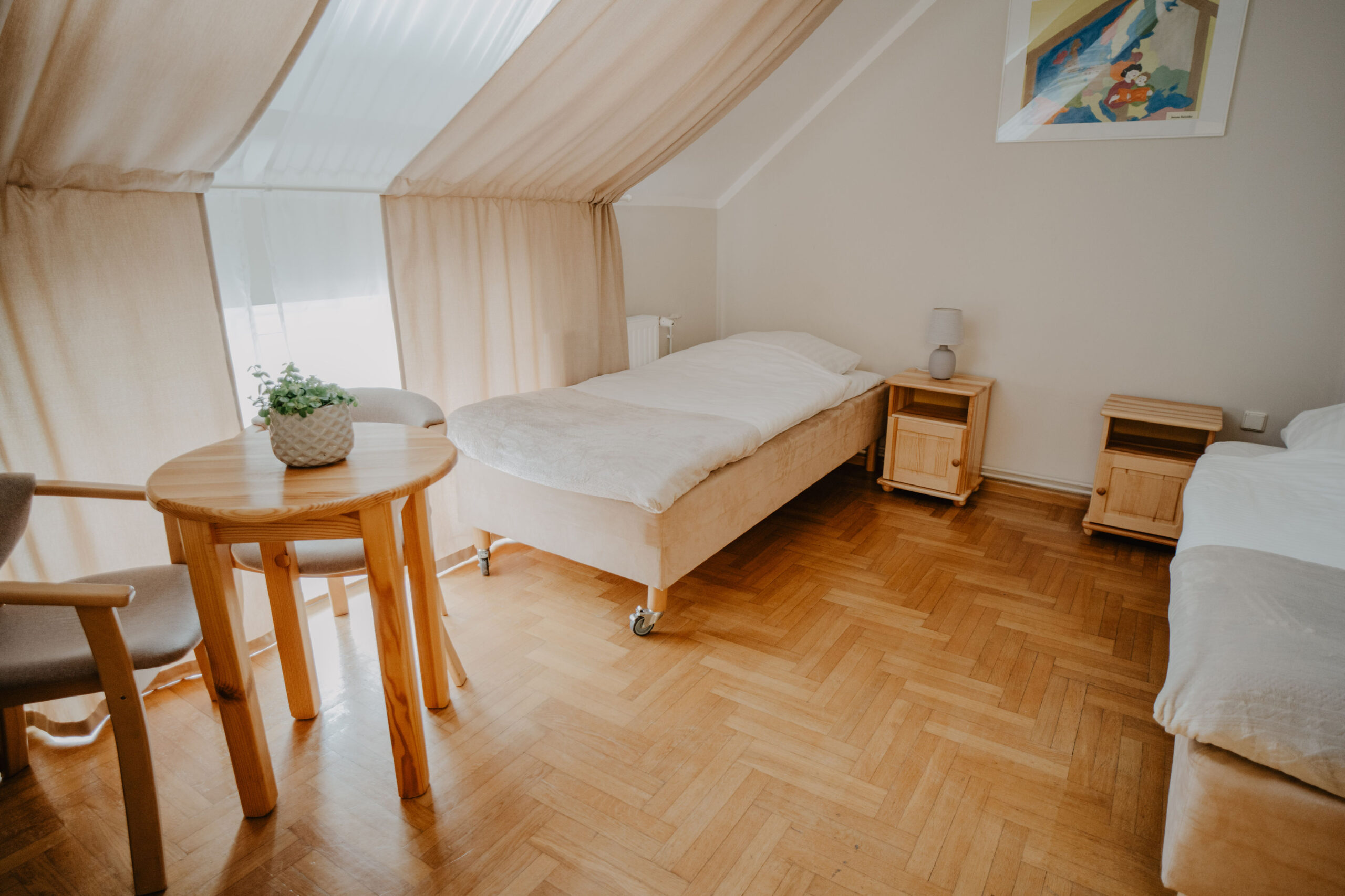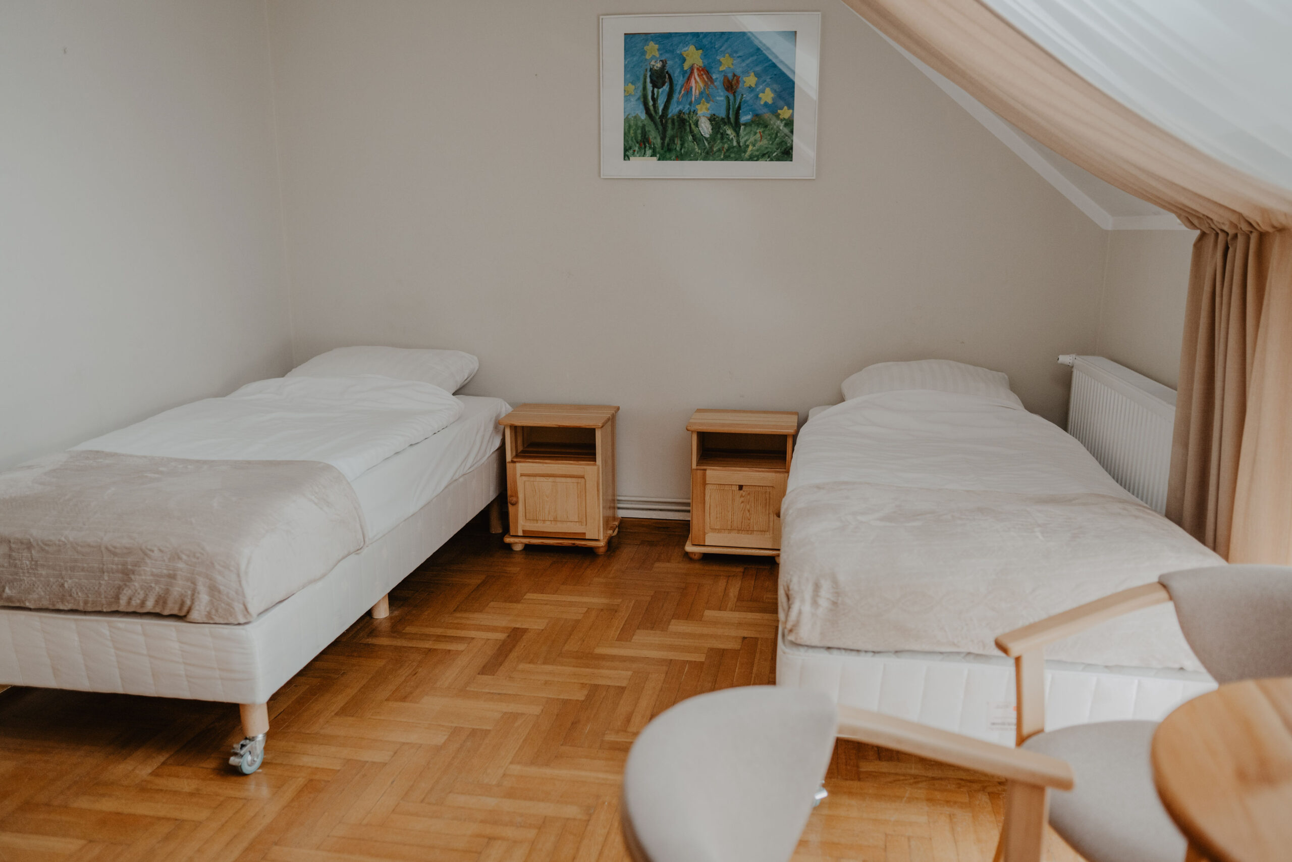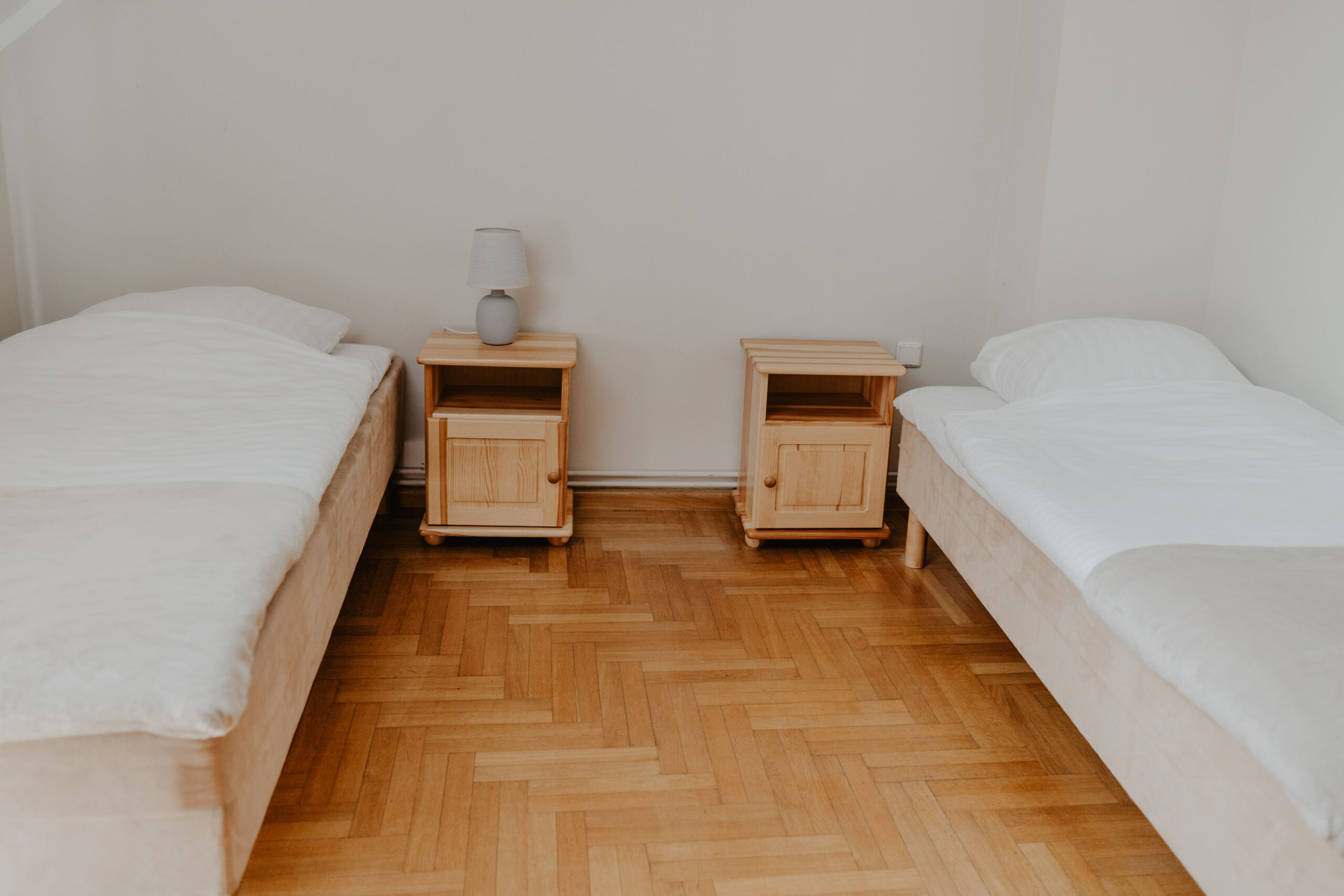 Comfortable quadruple room with private bathroom on the first floor of Obora. It consists of a hall, a room, a bathroom with a shower and a separate room with a table and chairs. The room has four single beds, four bedside tables with lamps, a wardrobe with clothes hangers and a table with three chairs. In the private bathroom with a shower you will find a set of towels, soap and toilet paper. Free internet is available in all our buildings.