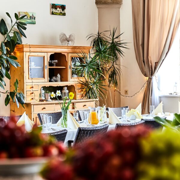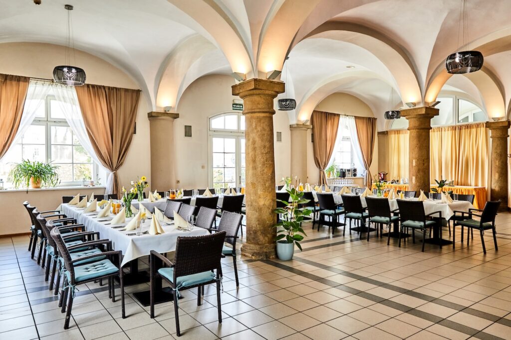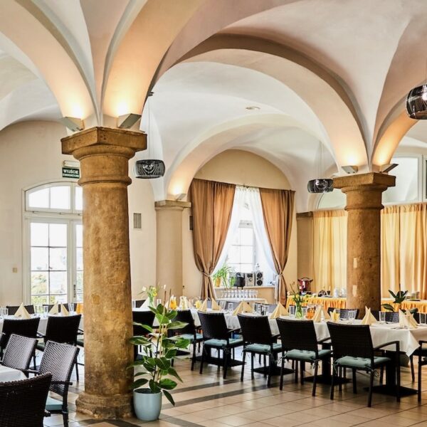 Restauracja U Hrabiego znajduje się na parterze Obory. To przestrzeń, w której organizujemy kameralne spotkania dla mniejszej liczby gości – obiady i kolacje firmowe oraz imprezy okolicznościowe w gronie rodziny i przyjaciół (chrzty, komunie, urodziny czy stypy). W zależności od liczby uczestników przyjęcia organizowane są w części lub w całej sali restauracji. W przypadku mniejszych uroczystości oddzielamy część przestrzeni specjalną kotarą. Charakterystyczne sklepienie z kamiennymi kolumnami tworzy niepowtarzalny klimat tej przestrzeni. Ustawienie stołów i krzeseł dostosujemy do potrzeb Twojego wydarzenia. Wejście do restauracji bezpośrednio z dziedzińca lub z holu wejściowego w Oborze.
