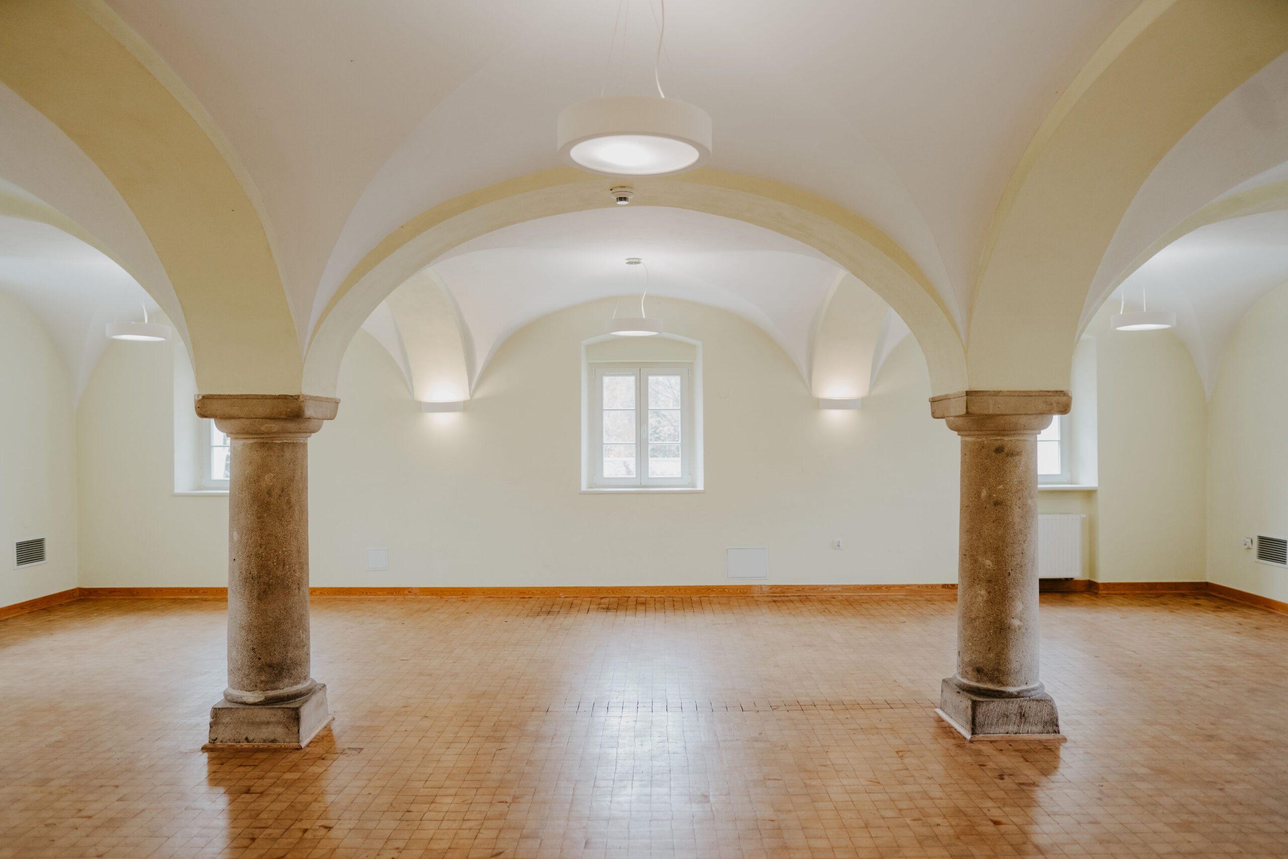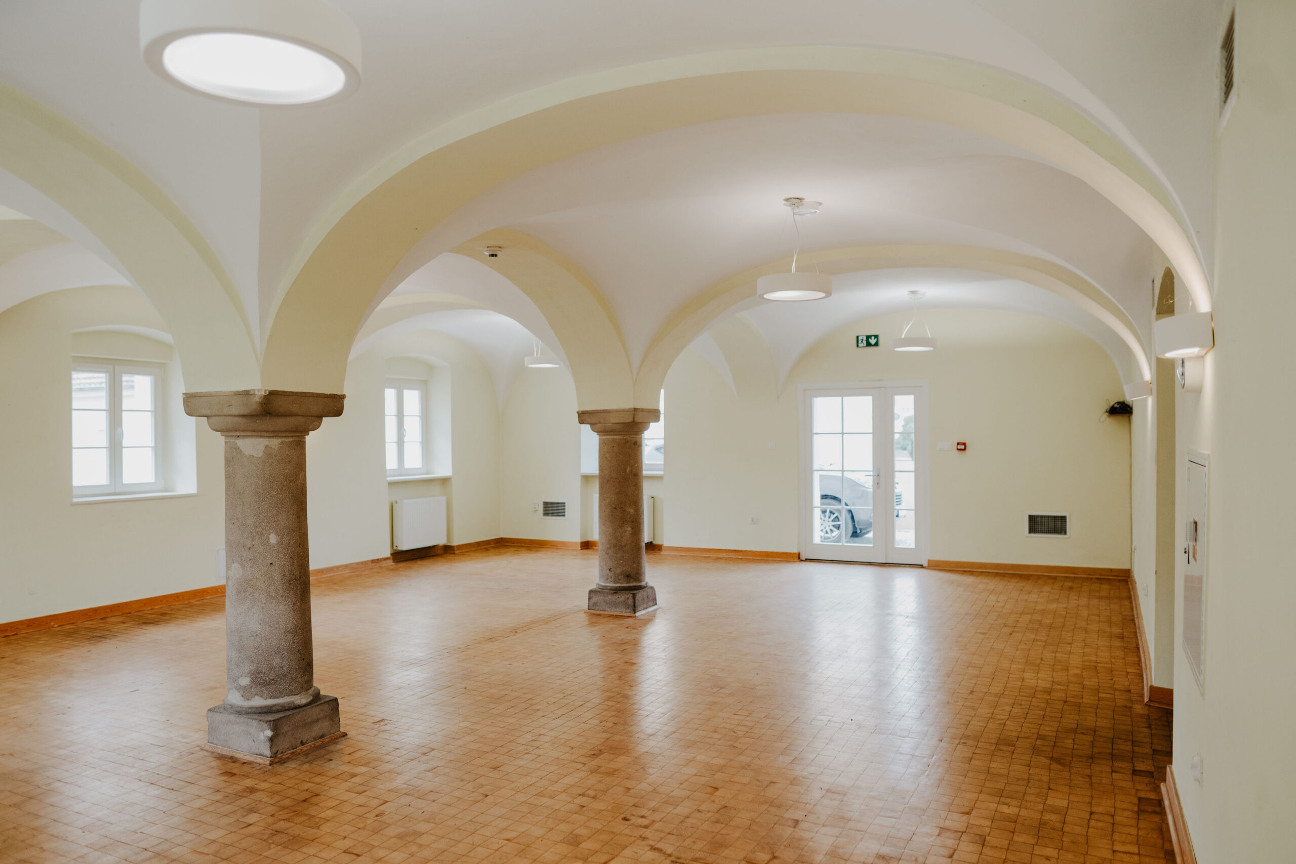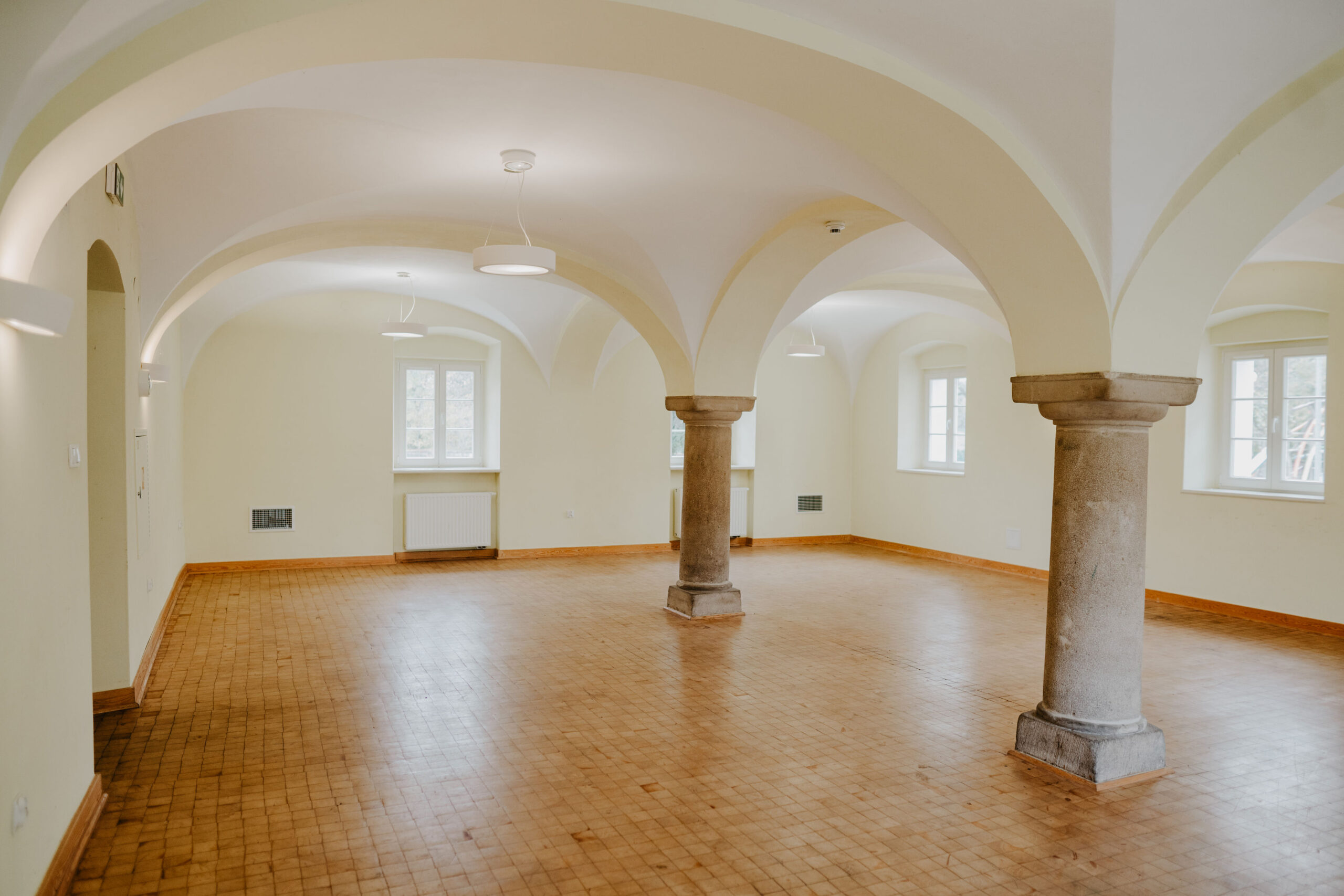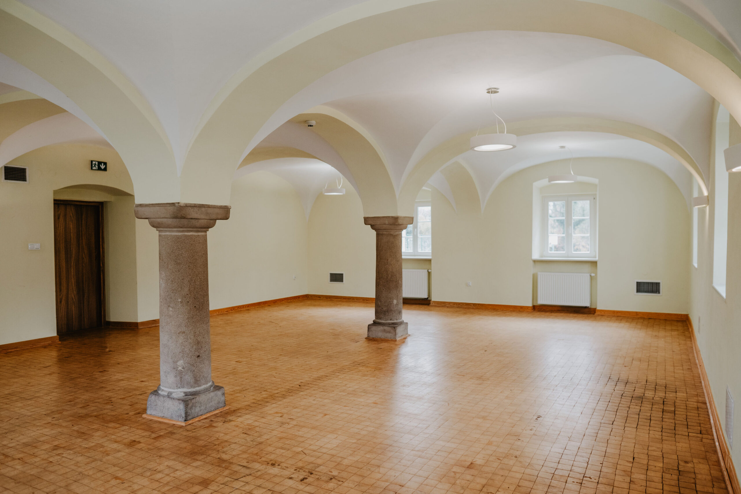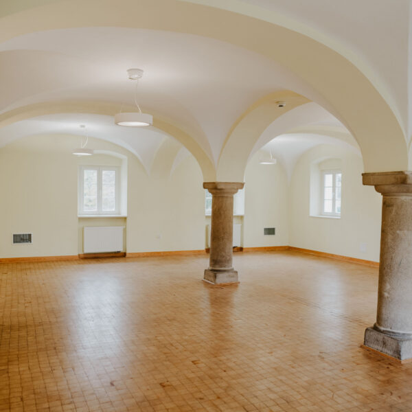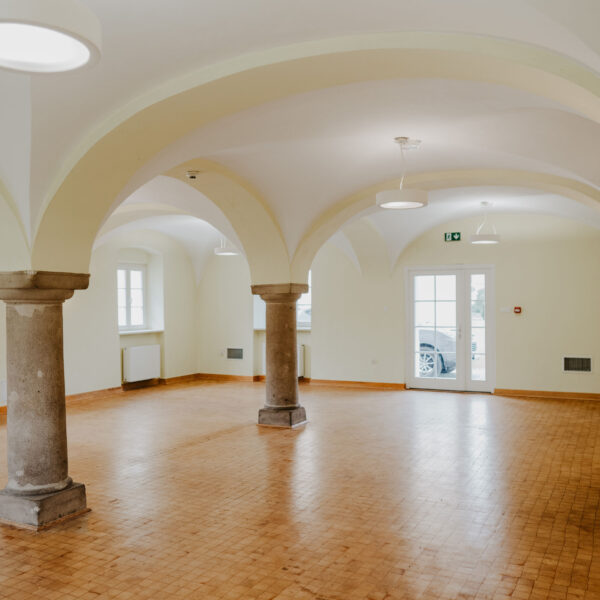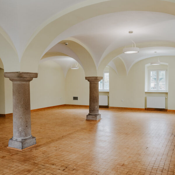 Sala na parterze Stajni to kameralna przestrzeń konferencyjno-bankietowa, idealna do organizacji wydarzeń dla mniejszej liczby gości – szczególnie przyjęć okolicznościowych w gronie rodziny i przyjaciół (wesel, chrztów, komunii, urodzin czy styp). Charakterystyczne sklepienie z kamiennymi kolumnami oraz drewniana podłoga tworzą wyjątkowy klimat tej przestrzeni. Ustawienie stołów i krzeseł dostosujemy do potrzeb Twojego wydarzenia. Wejście do sali bezpośrednio z dziedzińca.