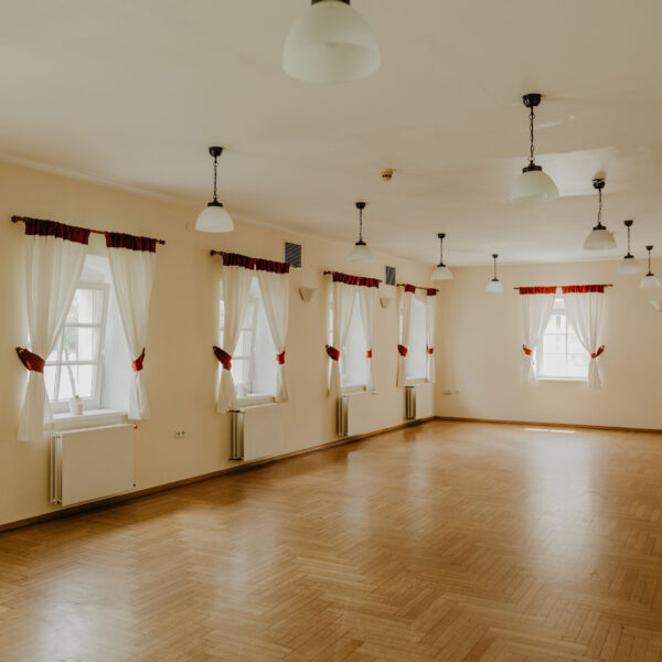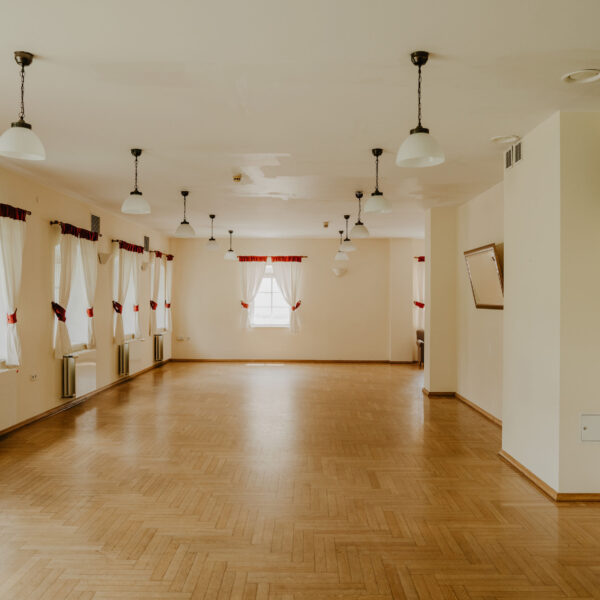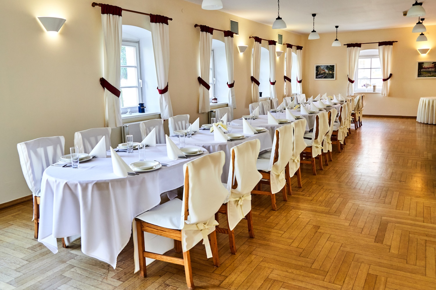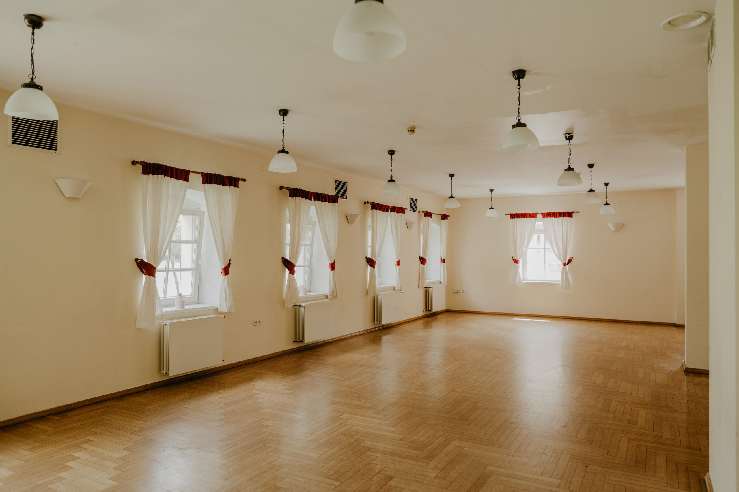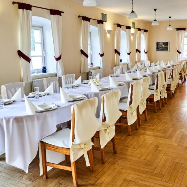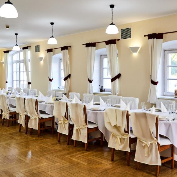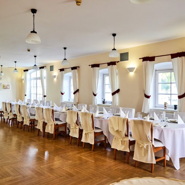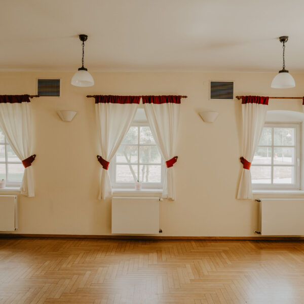Sala Śniadaniowa na parterze Spichlerza to kameralna przestrzeń konferencyjno-bankietowa, idealna do organizacji wydarzeń dla mniejszej liczby gości – szkoleń, konferencji, świątecznych spotkań pracowniczych oraz imprez okolicznościowych w gronie rodziny i przyjaciół (wesel, chrztów, komunii, urodzin czy styp). Okna wychodzące na zabytkowy dziedziniec i drewniana podłoga nadają wyjątkowego klimatu tej przestrzeni. Ustawienie stołów i krzeseł, jak również elementy potrzebne do organizacji przyjęć i konferencji (np. rzutnik, ekran i nagłośnienie) dostosujemy do potrzeb Twojego wydarzenia. Wejście do sali przez lobby bezpośrednio z dziedzińca.